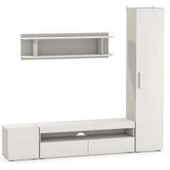Модный урбанистический дизайн и светлые декоры. Все модули можно собрать в готовую композицию, скрепить между собой, получив жёсткую конструкцию. Тумбы под ТВ может быть укомплектована подсветкой, которая эффектно смотрится в интерьере и подчёркивает широкую нишу, свободную от перегородок. Тумба под ТВ подготовлена для прокладки проводов телевизора и медиа-техники. Большинство фасадов освобождены от лицевой фурнитуры, а ручки на пеналах выполнены из алюминия.